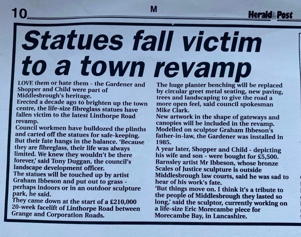 Afterwards, the statues were kept in storage at Stewart Park, before ending up in the garden of Ayresome School in 2004 (where they were repainted by staff and students). I’ve not managed to get over to see if they’re still there. If anyone knows, drop me a message.