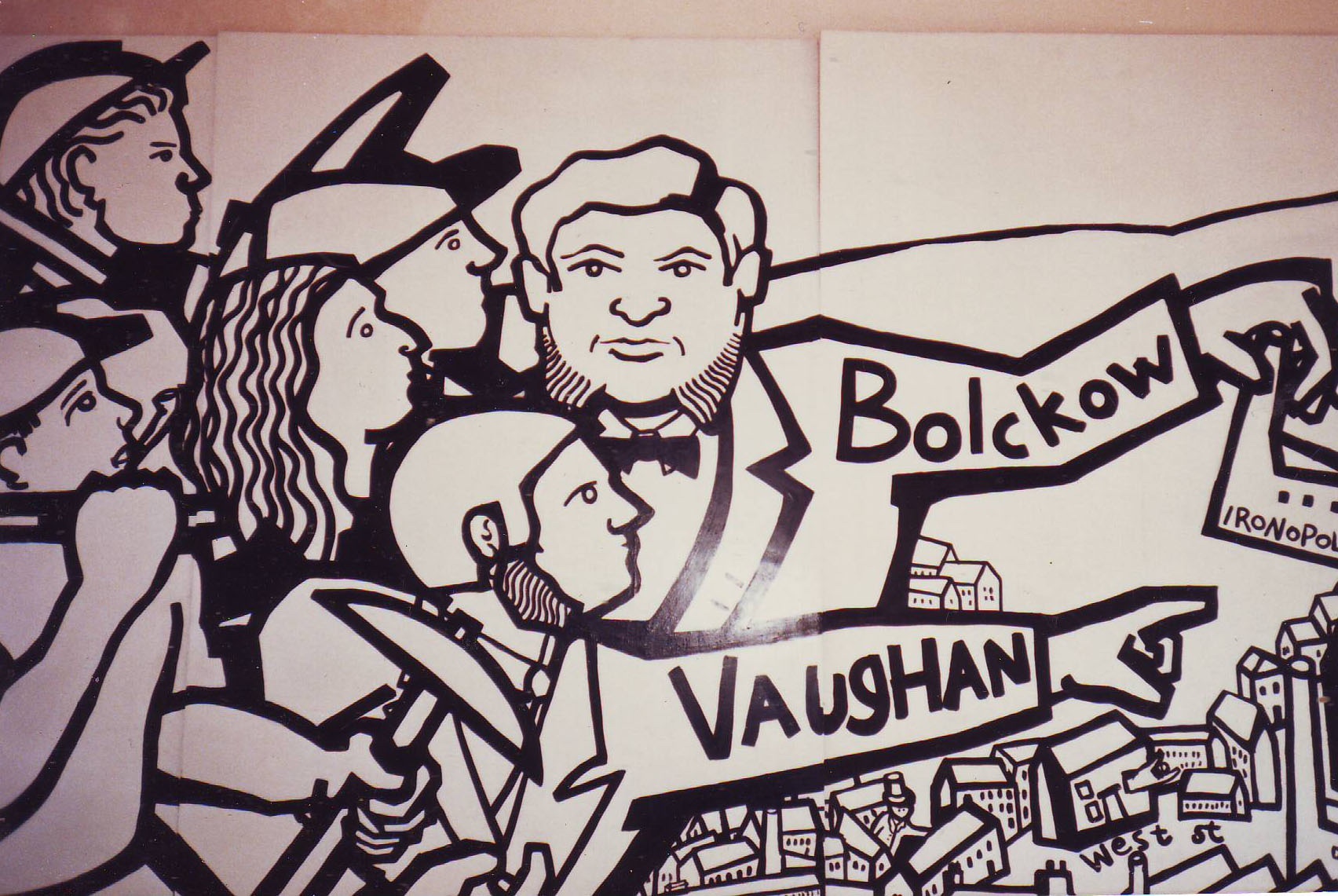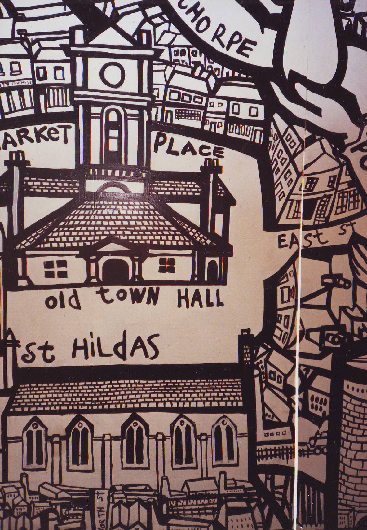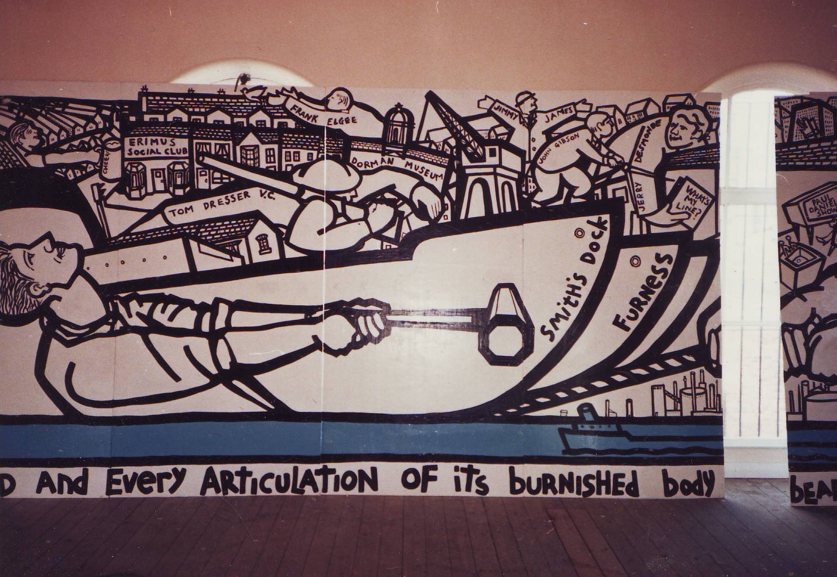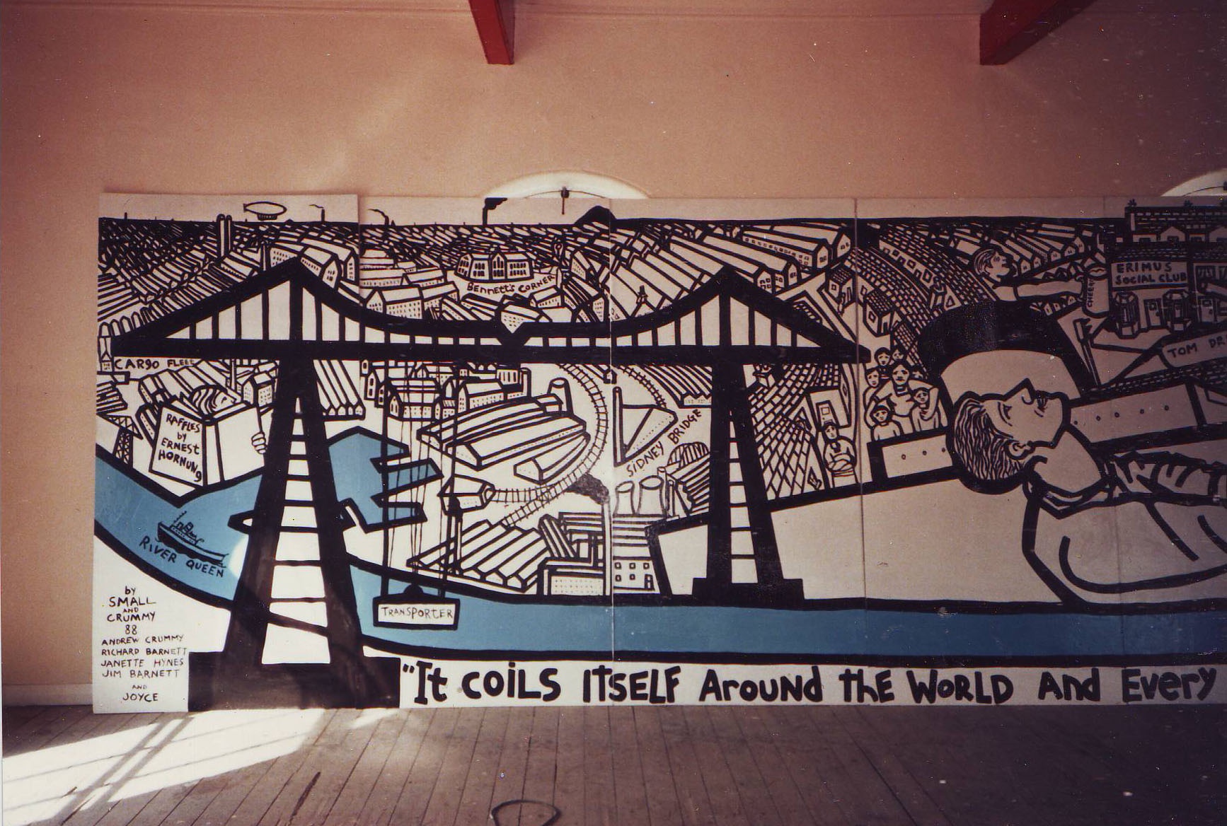 The murals were custom made for the town, drawing on its industrial heritage, landmarks and history. Crummy worked with local artists Richard Barnett and Janette Hynes to complete the work, which was painted at the old Post Office in South Bank. Most of the background information for the work was collected by Richard’s father Jim Barnett, who was an keen local historian, while his mother Joyce did the cooking for the artists as they worked.
