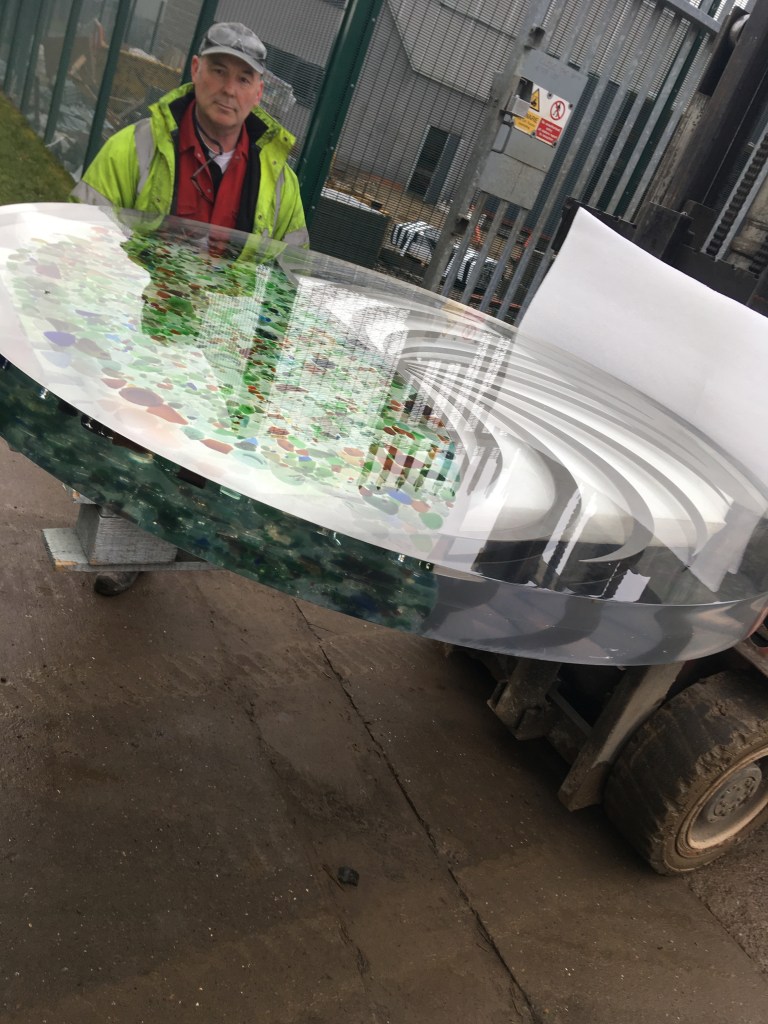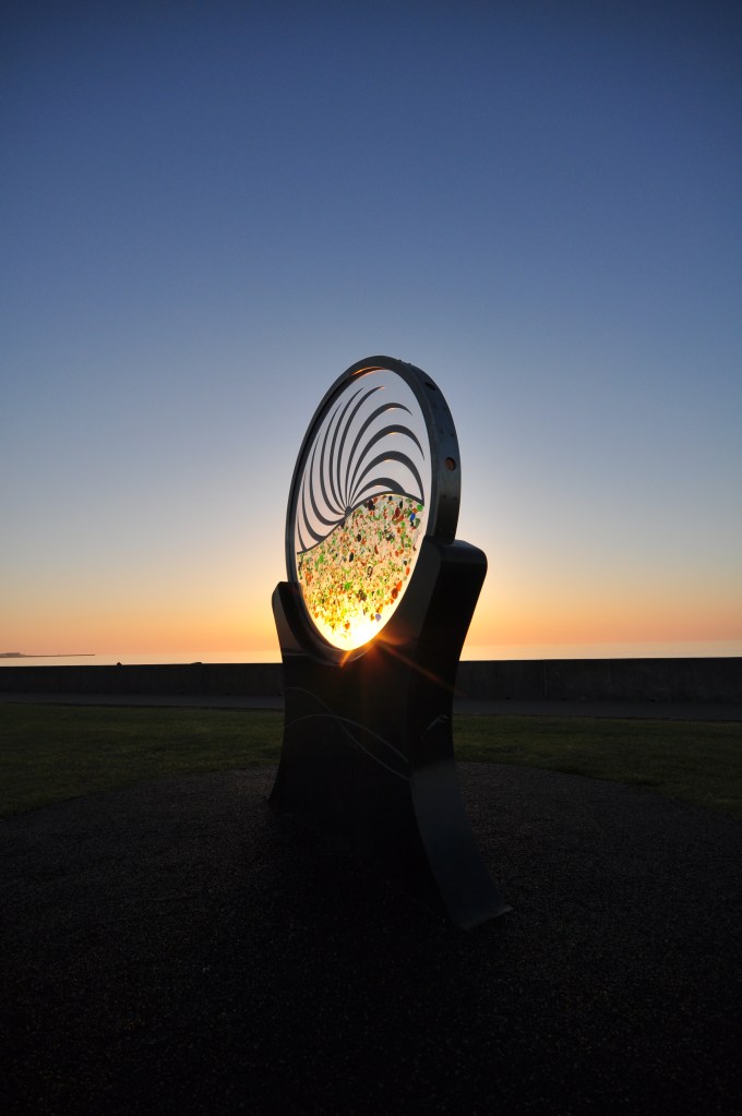 Sea-glass collected by local schools and community groups from Middleton Beach (once a Victorian dumping ground) is suspended with laser cut steel in a cast resin disk, giving the impression of being both caught in motion and frozen in time.