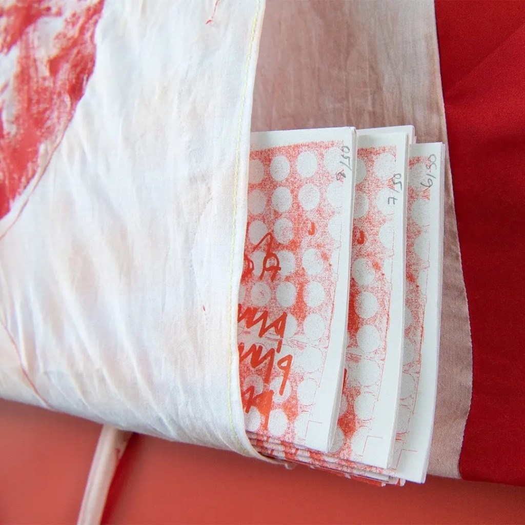 There was a surprise hidden in the piece too. In a workshop held by WetDoveTail to celebrate International Colour Day, the public were invited to create zines on the theme of the colour red. This work was compiled and turned into Iimited-edition, risograph-printed zines, which were secreted in a pocket of the artwork. These zines included information about local textiles industry links, short texts about the colour red, as well as additional content made by the citizens of Middlesbrough.