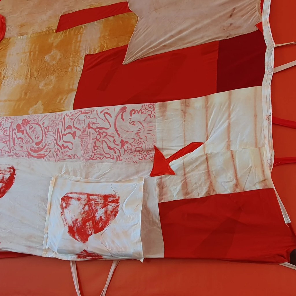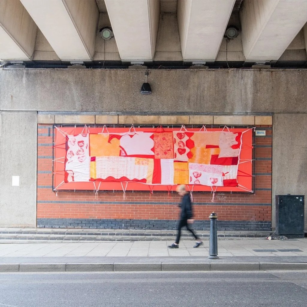 Jade Blood‘s textile work #e11b22 (that’s the hexadecimal colour code for the shade of red used in the Middlesbrough FC badge) – tucked under the A66 flyover – is the result of a workshop exploring the science and heritage of the colour red.