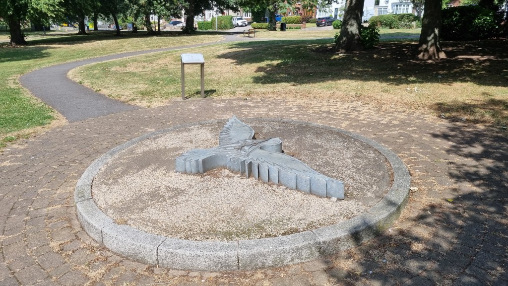 Created for Billingham Peace Garden (and sited near the war memorial), Andrew McKeown’s Peace Dove was commissioned by Stockton Council. It depicts a dove holding an olive branch (a design specified by the council) lying flat on a pre-supplied plinth.