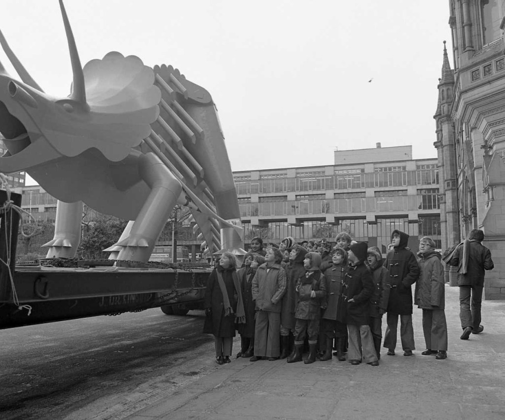 Here’s a photo by John Buchan of some local dignitaries next to the first Teessaurus, at the unveiling in February 1979.