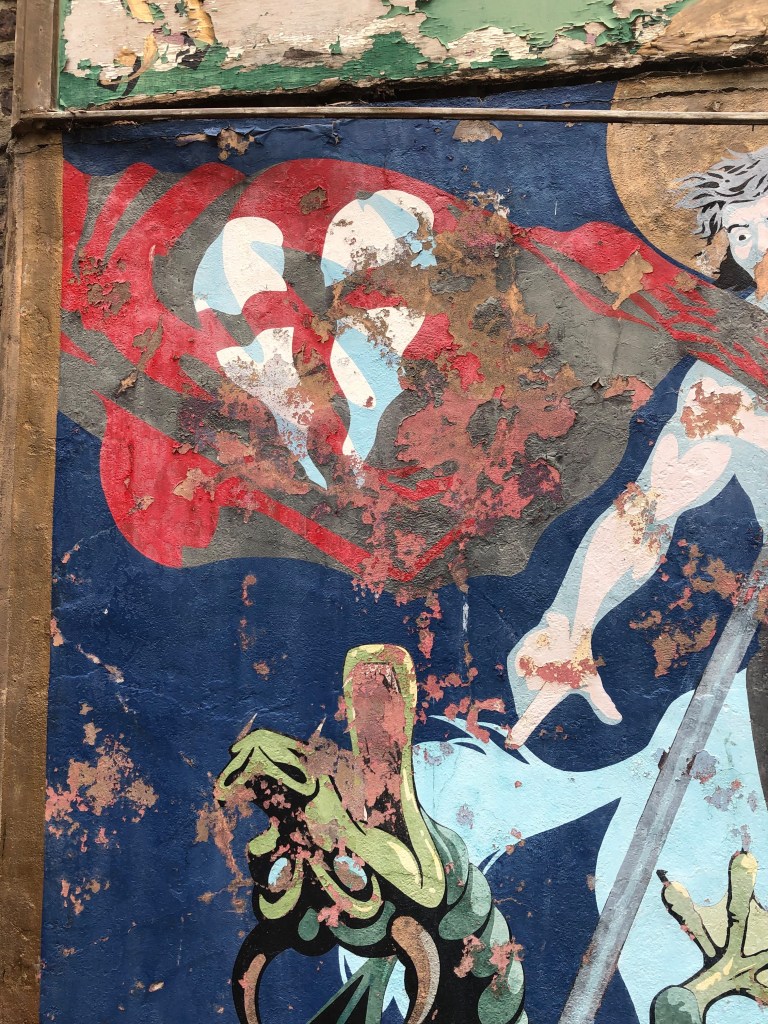 But the fight against the elements never ends. By 2019 the work was heavily damaged and in danger of disappearing completely. The decision was made to both preserve and replace it. A new version of the mural – completed by local designer Abby Taylor – was installed over the original (which remains underneath), ensuring that Zak’s work remains – in spirit – within the walls of Green Dragon Yard.