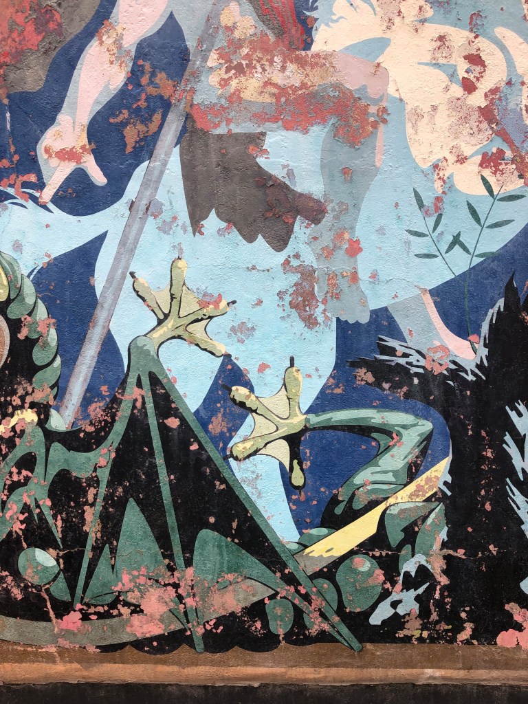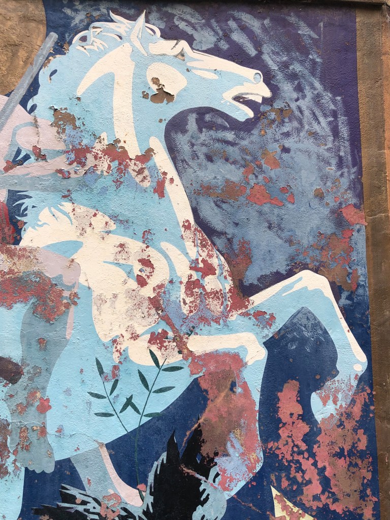 Murals fade and decay. Around ten years later, Zak was commissioned by the local council to restore the work. He made some alterations to Saint George’s face and the dragon’s tongue and tail, as well as adding an olive tree which can be seen in the photos below.