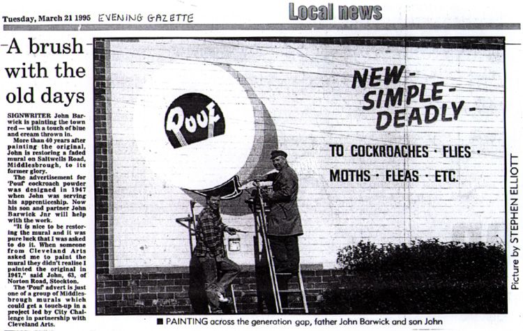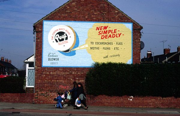 In an attempt to preserve Middlesbrough’s old painted advertisements, Cleveland Arts and City Challenge began a scheme to restore them in the mid-90s. One of the beneficiaries of this was the distinctive Pouf Cockroach Powder mural on the corner of Saltwells Road and Breckon Hill Road.