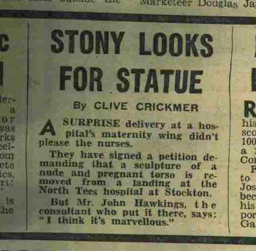 But exhibited it (briefly) was. A consultant friend of the Hawking family (confusingly named John Hawkings), who worked at North Tees Hospital, noticed the statue and thought it would be perfect for the Maternity Ward. Eddie and Audrey agreed, and the artwork was moved there in 1974.