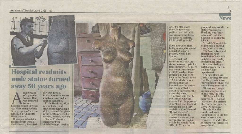In late 2022, the completed ‘Audrey’ was finally dispatched back to the hospital, 68 years on from its creation and nearly 50 years after its ignominious removal. In April 2023, the statue was re-unveiled in a ceremony featuring Eddie’s sons Chris and Andy Hawking (the baby in the belly); Jane Ross a receptionist from the ward; Shaun Campbell from Arthur Wharton Foundation; along with representatives from BBC Tees.