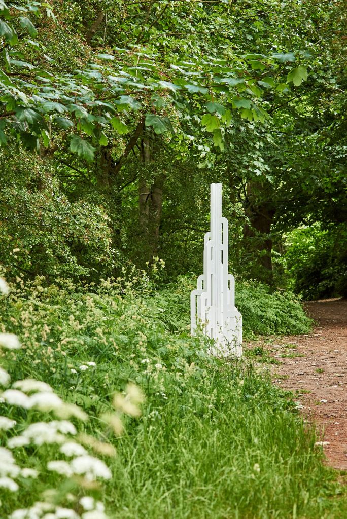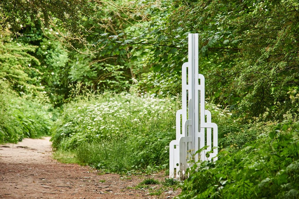 “A tower of interlocking planes, Cascade is inspired by how humans influence the river at this location. Made from painted galvanised steel, the forms and shapes are designed to echo water falling down the weir. Each plane has flowing lines and forms carved into it with random different sized cut-out circles, representing the foam that forms as water enters the pools below.“