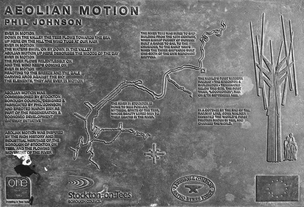 Aeolian Motion – the work of the late Phil Johnson – was installed in Stockton in 2001 near the River Tees (the exact location is on the map below). The name of the piece refers to the motion of the air, which moves the “leaves” of the sculpture into different positions, something I chanced to notice when sitting under it during the Stockton Fringe Festival with a warm beer many moons ago.