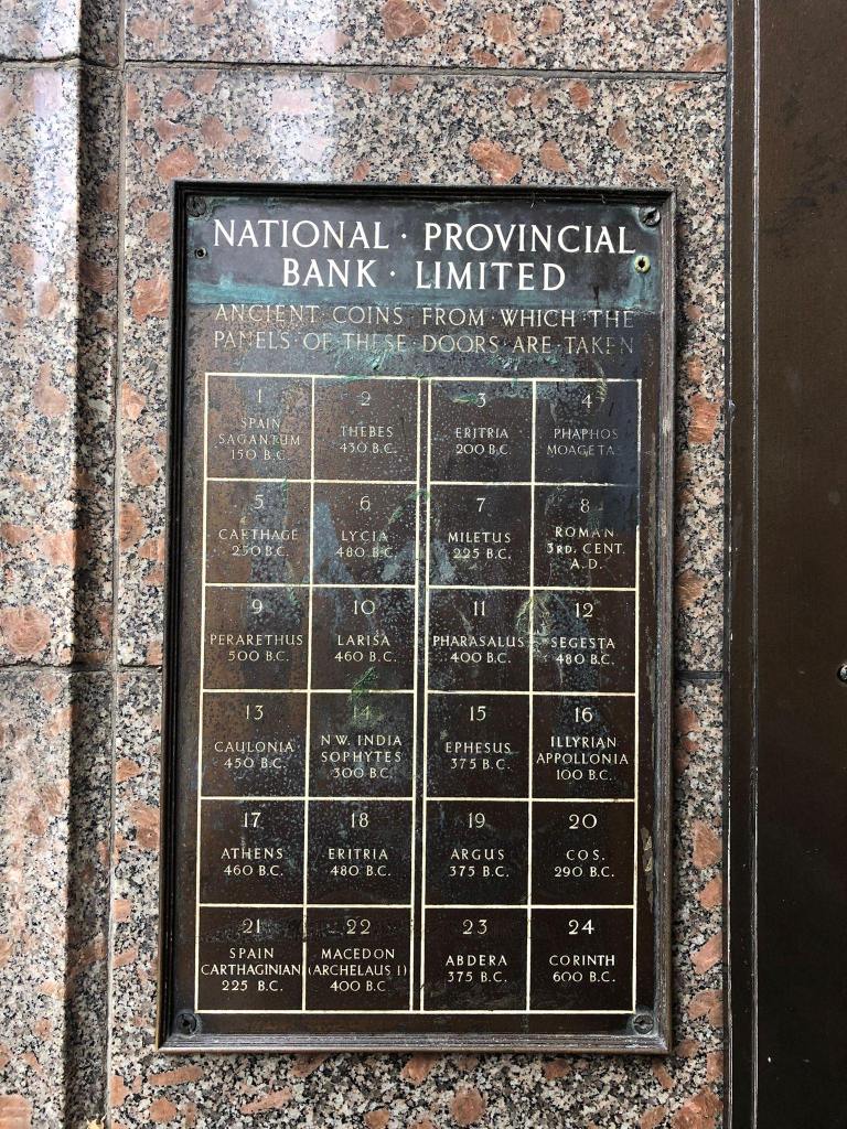 Almost certainly the work of architect W.F.C. Holden (who made a similar, silver-coated set at the Coventry branch), these huge bronze panels show designs from various ancient coins (there’s even a nice explanatory panel on the wall next to them). A nod to the enduring solidity of coinage and finance, where nothing can ever go wrong.