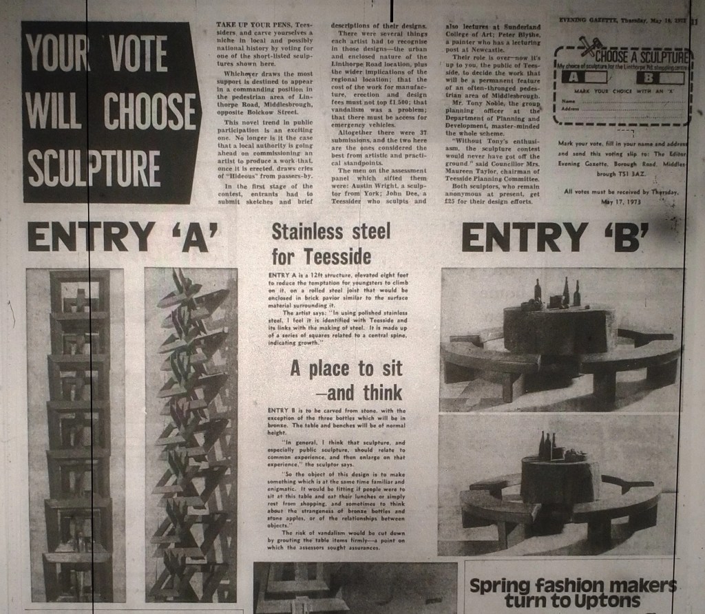 Installed during refurbishment of Middlesbrough’s Linthorpe Road in 1974, Sculpture 74 was one of the only pieces of public art in Middlesbrough chosen by a public vote. It was removed in the 1990s.