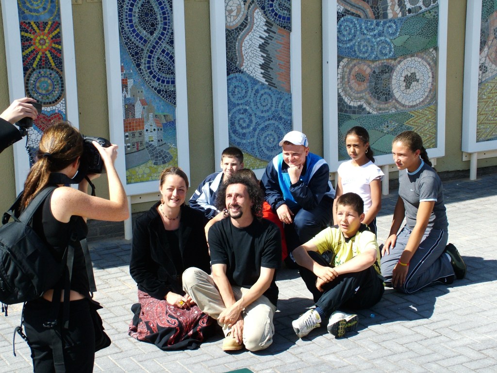 Artists Helen Gaunt & Derek Mosey with their daughter (1) and with local young people (2)