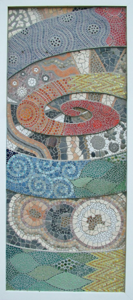 Whirling Rainbow is a polyptych (multi-panelled) work, with motifs of nature and industry swirling around abstract whorls. Smokestacks, wheels and the idiosyncratic steel spire of the church are contrasted with trees and curves evoking waves and seashells. It is – like any mosaic – painstaking labour of love containing the work of many hands.