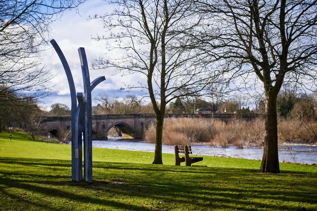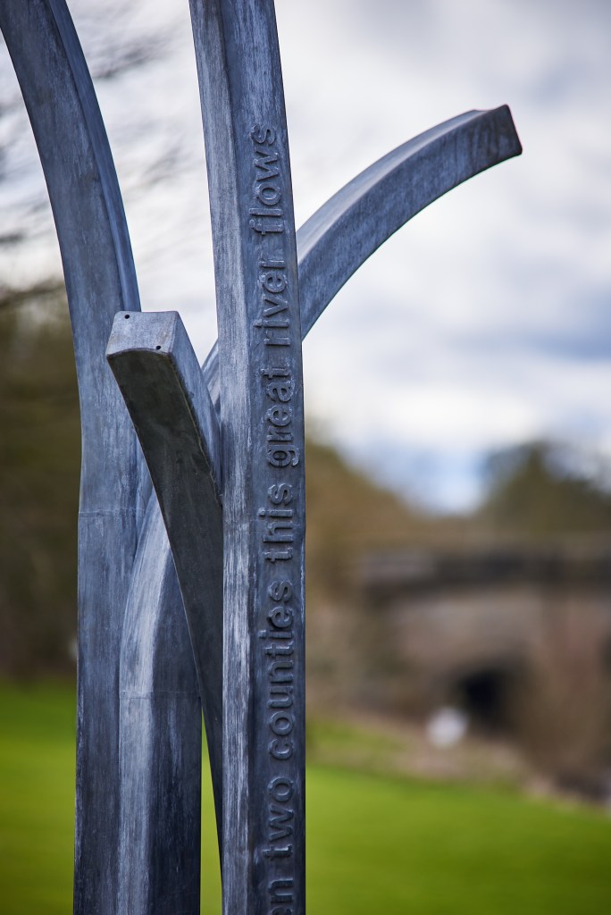 The pieces deliberately feel organic, as if they are ‘growing out of the ground’. Each a galvanised steel box section with etched words ‘Between two counties this great river flows’ to tie it with its particular location.”