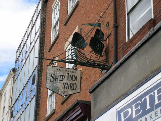 Ship Inn Yard’s sign displays a fine ship with sails upon the rolling sea. An anchor affixes it to the wall.