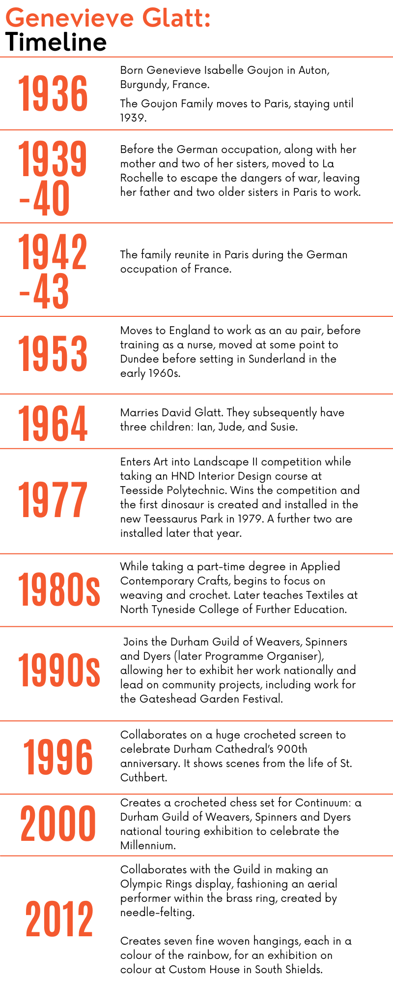 While many in Teesside may think of Genevieve Glatt in terms of Teessaurus Park, this work was a beautiful anomaly for her. Her journey as an artist and maker took in many forms and crafts, and it’s perhaps because her life has not been documented before that the idea of a mysterious artist – creating one giant work and then disappearing – has arisen.