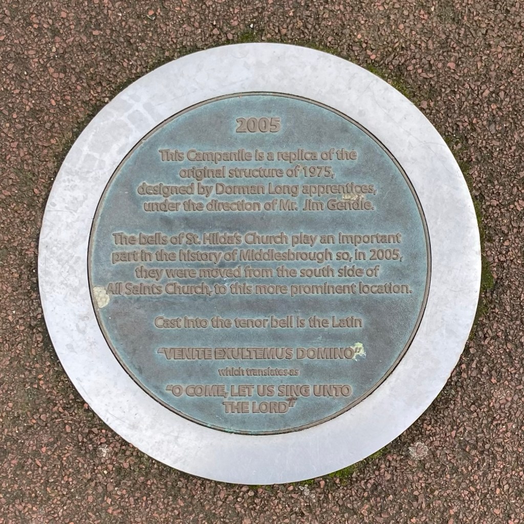 When the church was finally demolished, the bells were kept in storage until 1975 when they were placed on a steel campanile (or bell tower to the layperson) designed by Dorman Long’s Jim Gendle. This allowed them to ring again, but was tucked away behind All Saints Church (which is now next to the Cleveland Centre).